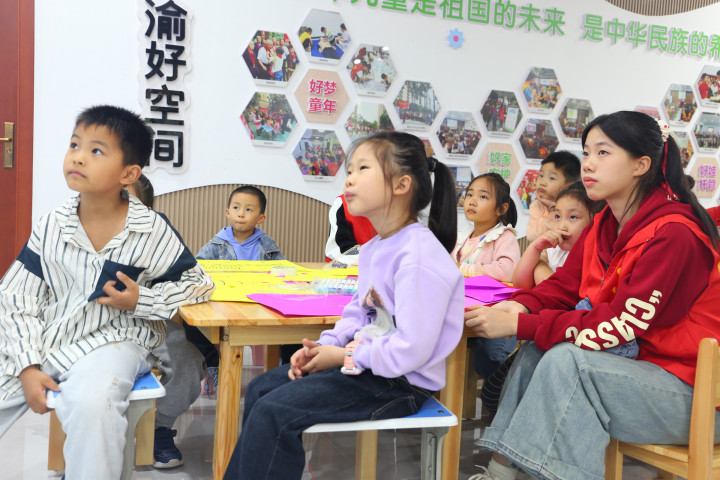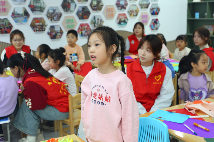 借光影呈民俗景,以问答传节日情。课堂伊始,志愿者播放重阳节主题视频资料,当画面展现“登高”“赏菊”等习俗场景时,志愿者小老师及时停下视频提问,孩子们瞬间挺直身子、争相举手,志愿者小老师从中挑选几位小朋友分享想法后,再补充节日背后的寓意,让孩子们在踊跃问答与生动画面中,更深刻地感知节日内涵。